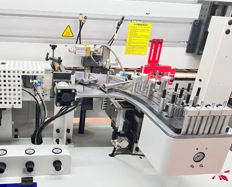 Maszyna posiada system przycinania zgrubnego i dokładnego, który precyzyjnie przycina górne i dolne paski obrzeża, usuwając nadmiar materiału.